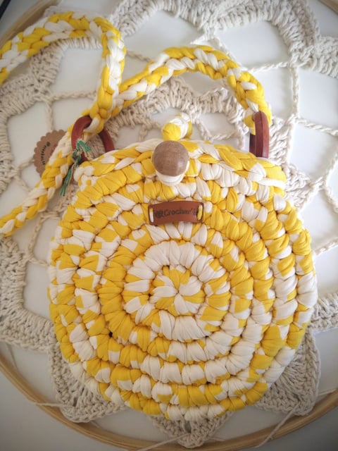 Medindo 20 cm diâmetro, feita com fio de malha residual* (resíduos da indústria textil), redonda com botão imantado, alça presa a argolas de madeira.