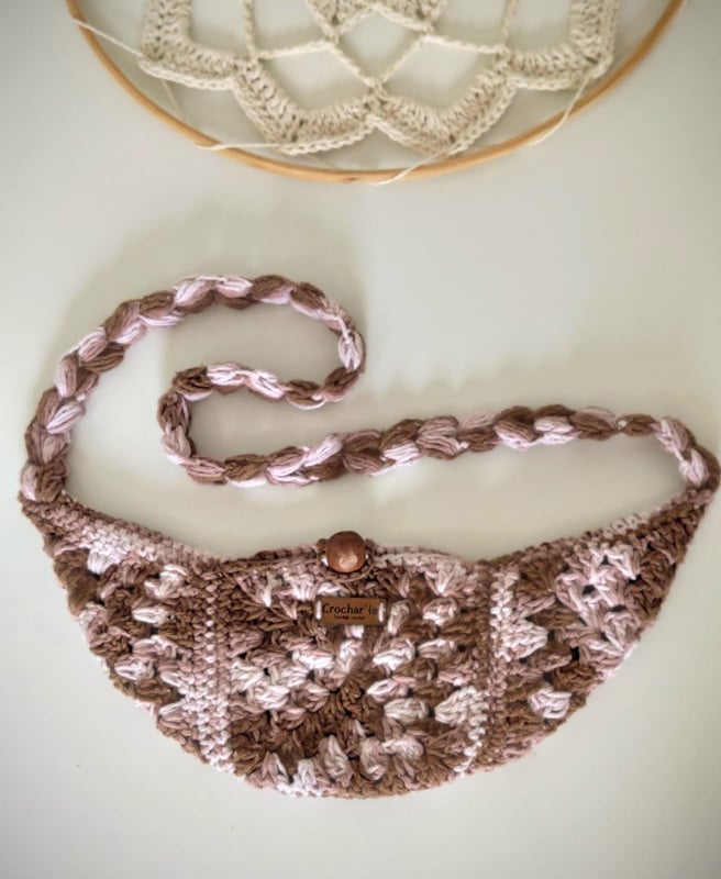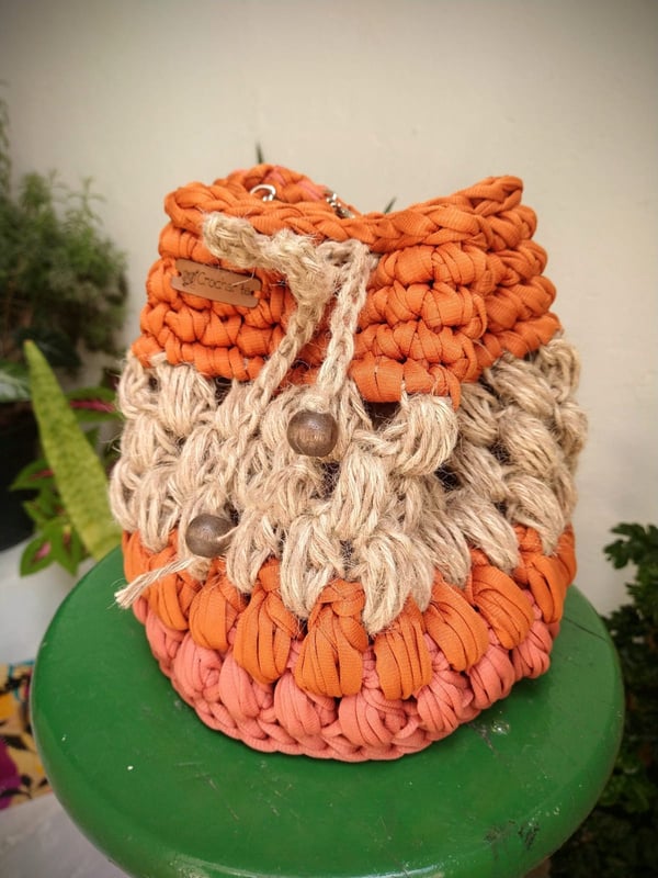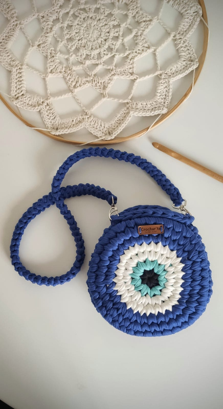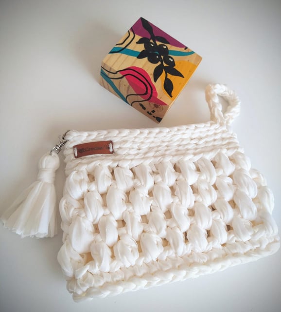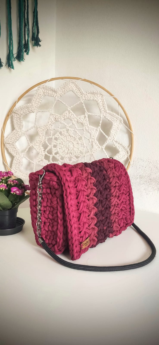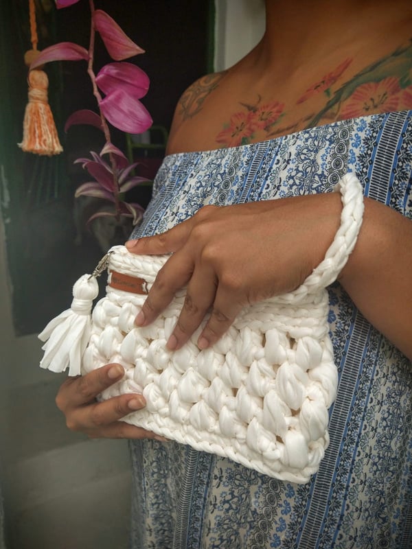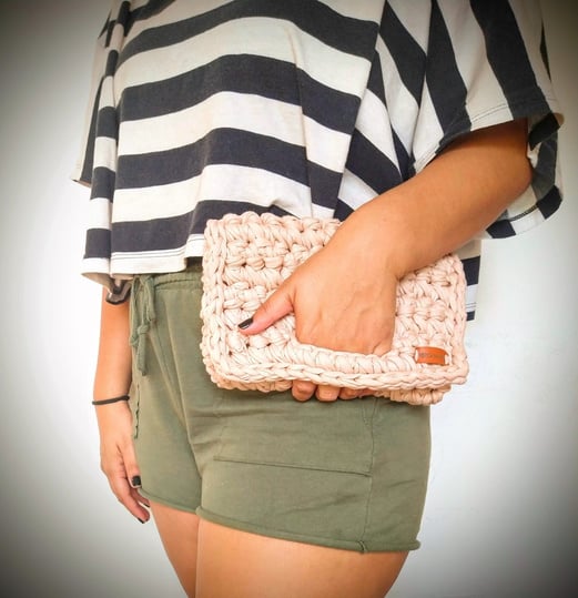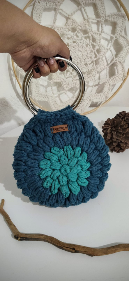 Medindo 25 cm x16 cm, feita com fio de malha residual* (resíduos da indústria textil), redonda com botão imantado e alça removível.