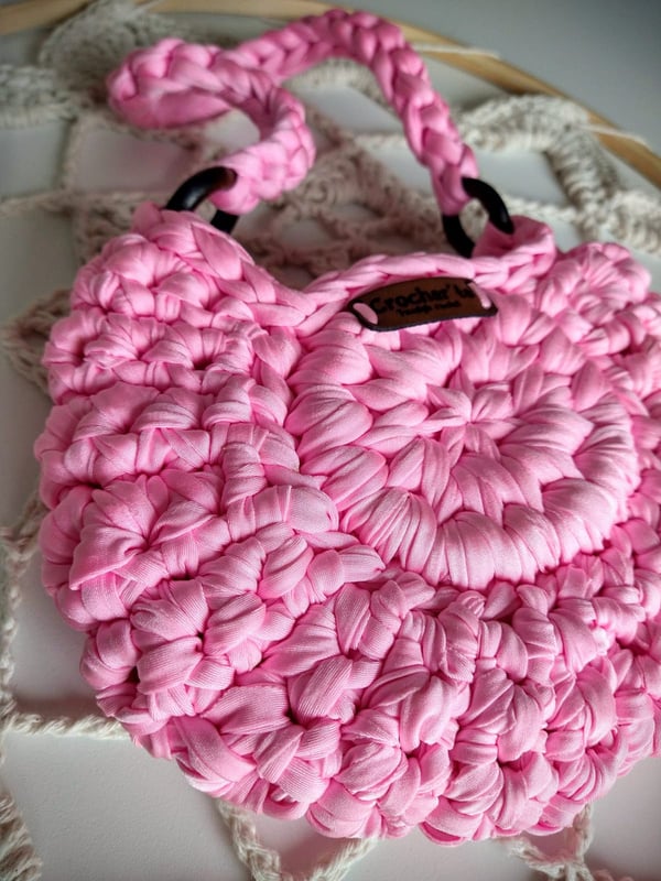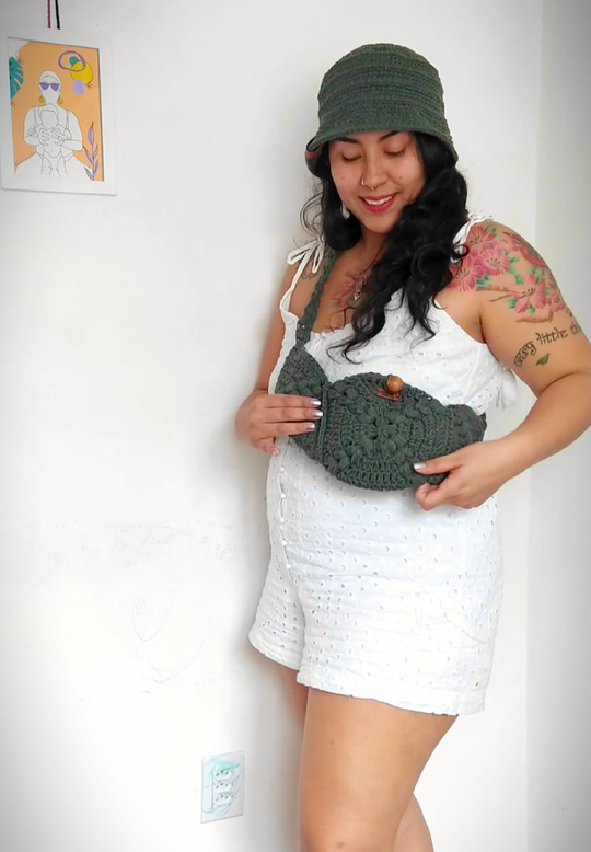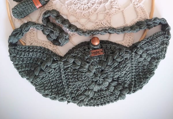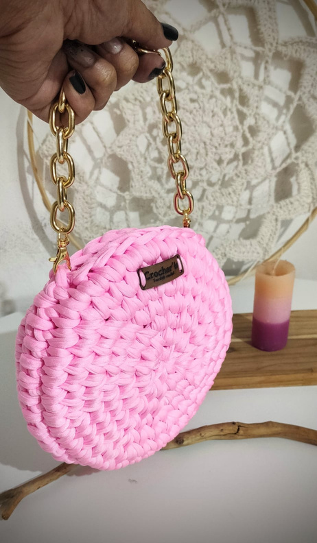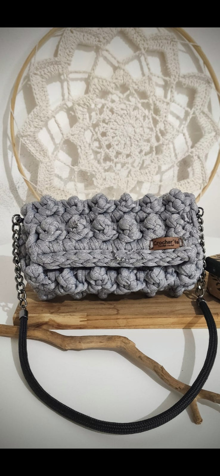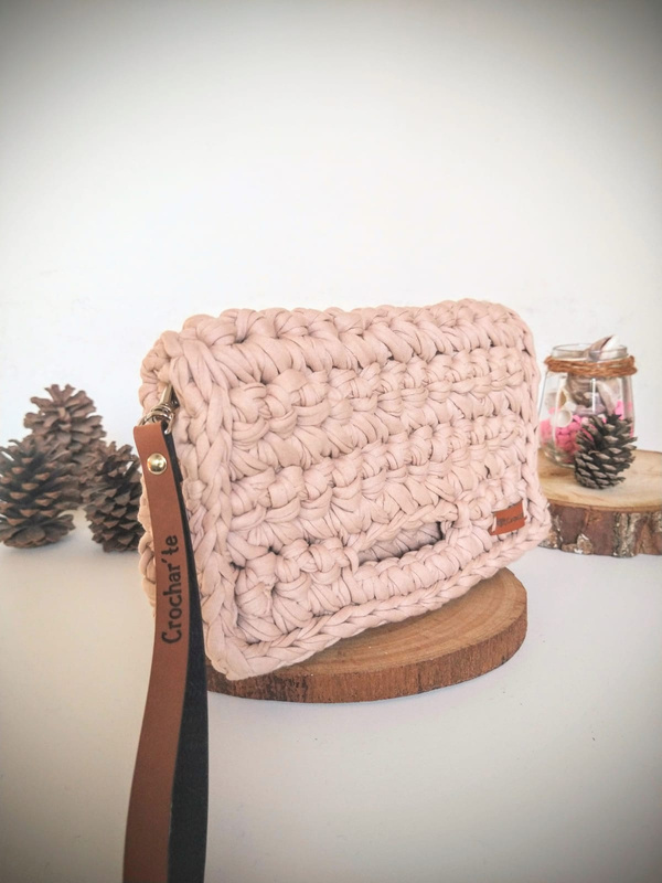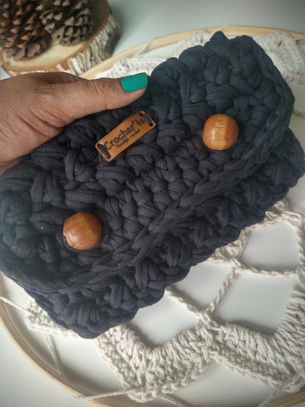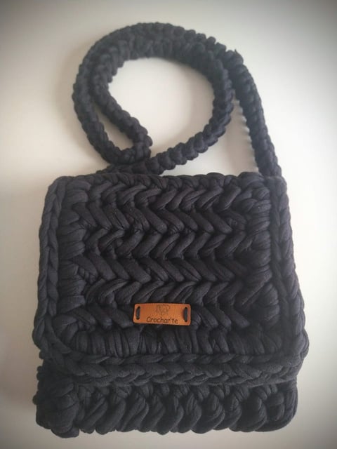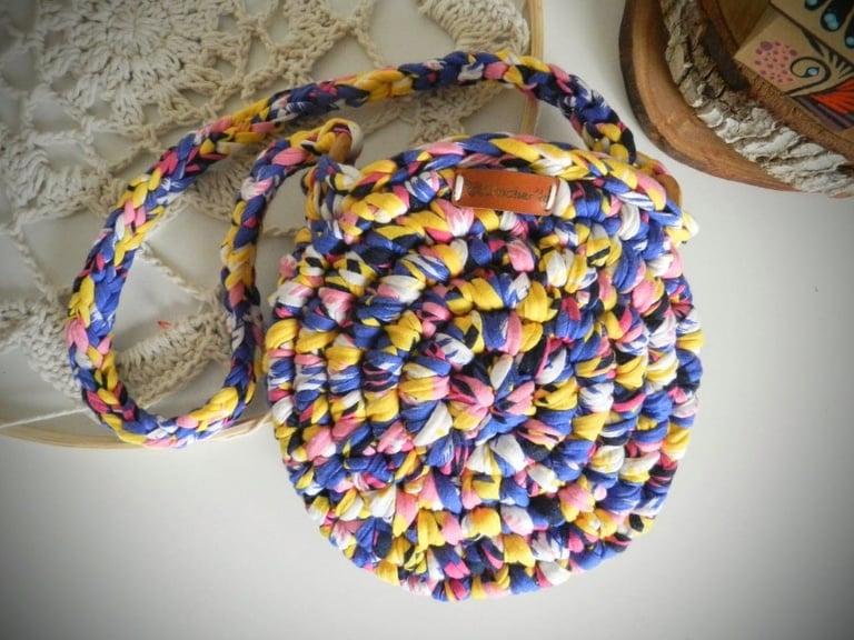 Medindo 25 cm x16 cm, feita com fio de malha residual* (resíduos da indústria textil), redonda com botão imantado e alça removível.