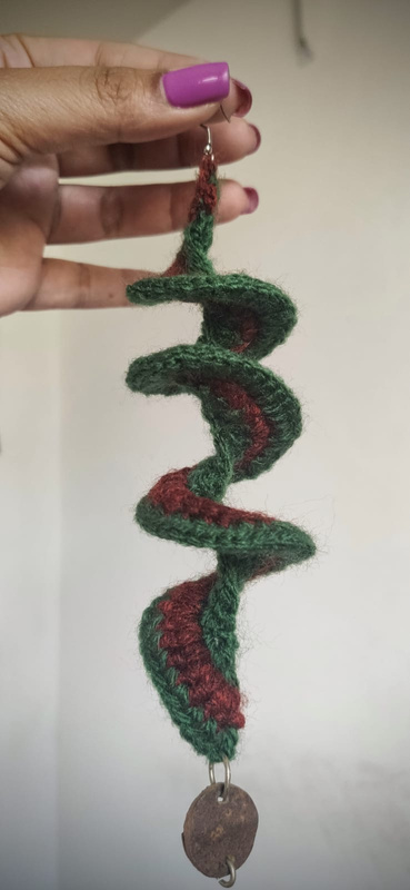 Fio estampado duas cores, argolas de madeira, fecho em botão de madeira. Medidas 20 cm x 20 xcm
